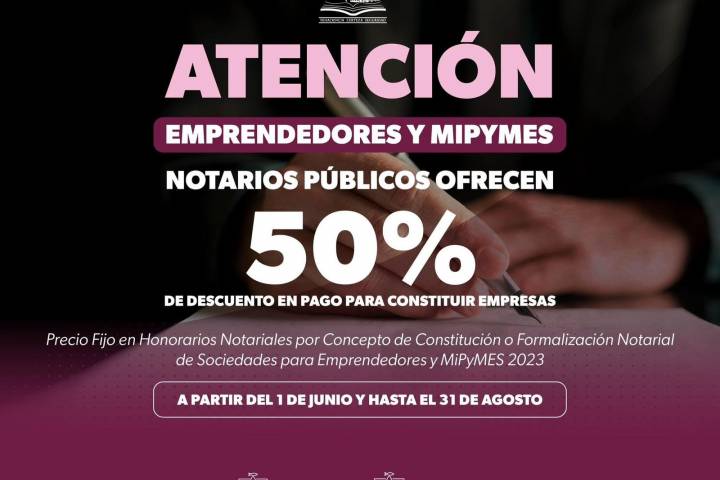 NOTICIAS 14/06/2023Llama Sedeco a aprovechar descuento del 50% en constitución notarial de empresas Con el propósito de que las y los interesados en aprovechar el descuento del 50 por ciento para la constitución o formalización notarial de sociedades para emprendedores y MiPyMES 2023, la Secretaría de Desarrollo Económico (Sedeco) tiene disponible online un formulario en la página de Espacio Emprendedor, en el enlace https://forms.gle/V5dWccyKsr969VXq7.