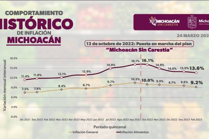 NOTICIAS 27/03/2023En 5 meses, bajó 2.5% índice inflacionario alimentario en Michoacán: Sedeco El descenso en precios de los 25 productos de la canasta básica registrado en Michoacán, impactó a la baja el índice inflacionario alimentario, que en general disminuyó un 2.5 por ciento en los últimos cinco meses, informó este lunes el secretario de Desarrollo Económico, Claudio Méndez Fernández.