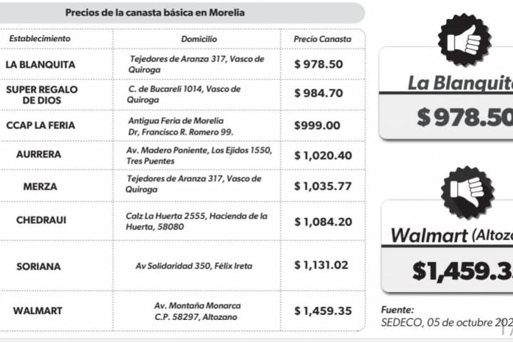 NOTICIAS 11/10/2022Presenta Sedeco precios de la canasta básica Como parte de la estrategia Michoacán sin Inflación, la SecretarÃa de Desarrollo Económico (Sedeco) da a conocer los precios que ofrecen las principales cadenas comerciales y centros de abasto de Morelia para 24 productos que conforman la "Canasta Básica" y que se considera cubren el consumo semanal de un hogar de cuatro integrantes.