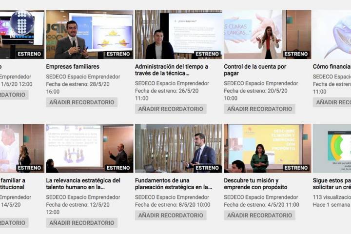 NOTICIAS 18/05/2020Ofrece Sedeco cinco cursos para emprendedores y empresarios Cinco cursos y talleres virtuales para emprendedores y quienes tienen un negocio, ofrece la Secretaría de Desarrollo Económico (Sedeco), en la segunda quincena de mayo, encaminados a fortalecer los proyectos empresariales durante el periodo de confinamiento por la contingencia sanitaria.