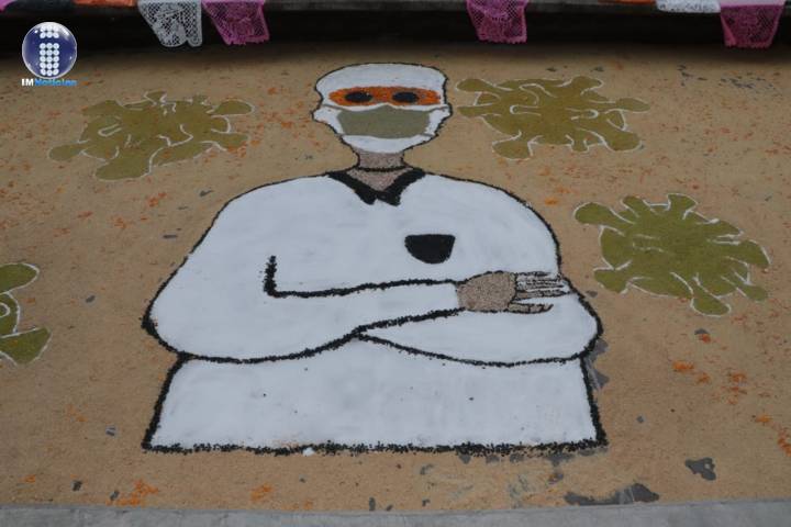 NOTICIAS 24/10/2020Instalan tapete de aserrín y flores alumnos de la UTM En honor al personal médico que durante la contingencia por el COVID-19 ha perdido la vida, estudiantes de la carrera en Biotecnología de la Universidad Tecnológica de Morelia, instalaron un tapete de aserrín y flores alusivo al Día de Muertos.