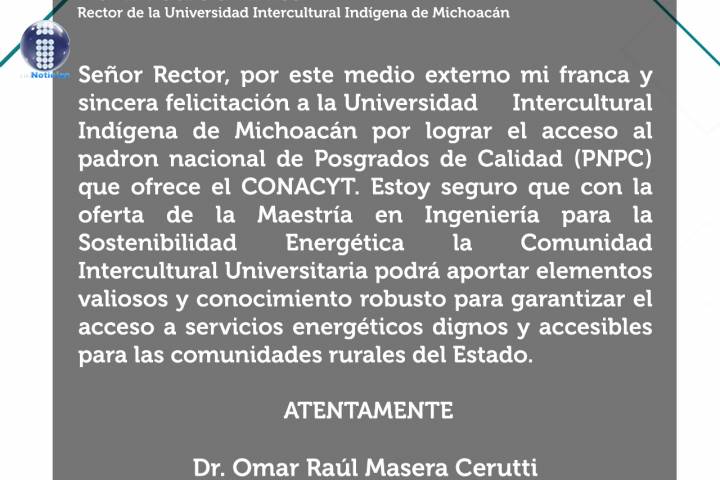 NOTICIAS 16/08/2020Ingresa UIIM a padrón nacional de Posgrados de Calidad CONACYT La Universidad Intercultural Indígena de Michoacán (UIIM) logró el acceso al padrón nacional de Posgrados de Calidad que ofrece el CONACYT, con la Maestría en Ingeniería para la Sostenibilidad Energética.