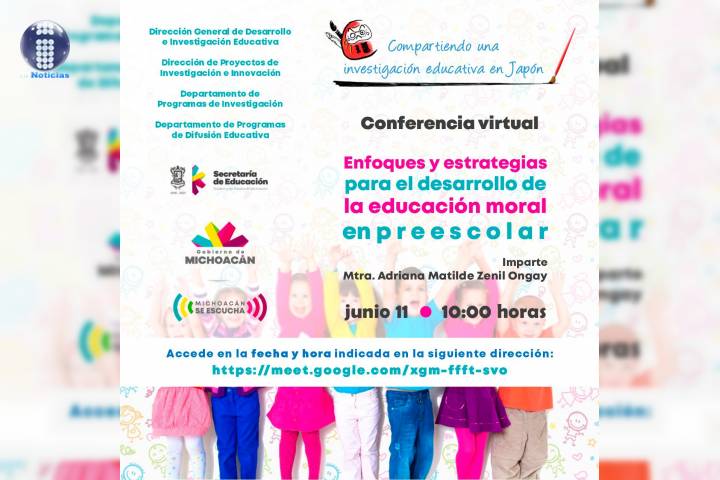 La Secretaría de Educación en el Estado a través de la Dirección de Proyectos de Investigación e Innovación llevará a cabo el próximo 11 de junio la conferencia virtual: Enfoques y estrategias para el desarrollo de la educación moral en preescolar, Compartiendo una investigación educativa en Japón. Ésta será impartida por Adriana Matilde Zenil Ongay, quien es licenciada en Educación Preescolar por la Escuela Normal Incorporada A...