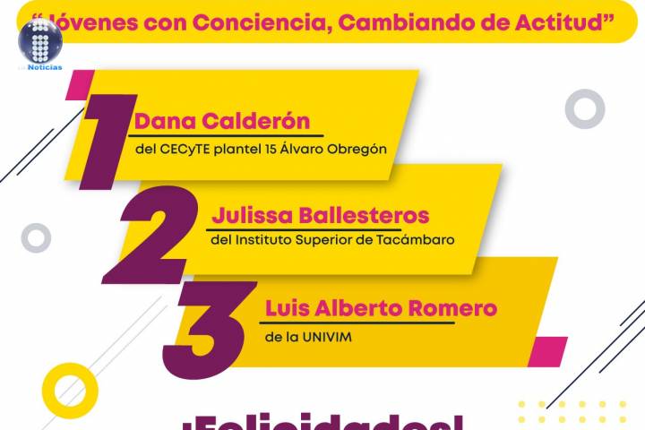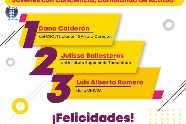 NOTICIAS 29/05/2020Ganan Dana Calderón, Julissa Ballesteros y Luis Alberto Romero concurso de video de la SEEN En el marco de la convocatoria realizada por la Secretaría de Educación en el Estado (SEE), a través de la Subsecretaría de Educación Media Superior y Superior, para que estudiantes participaran en el concurso de vídeo "Jóvenes con Conciencia, Cambiando de Actitud", este viernes se dieron a conocer a los ganadores.