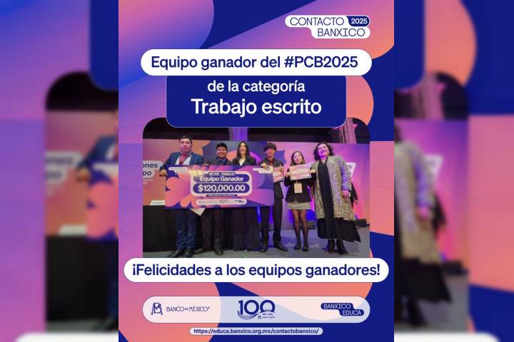El talento de los alumnos Isabella del Muro, David Hernández y Luis David Oliveros, de 5.º semestre, brilló en grande: ¡ganaron el Premio Contacto BANXICO 2025 en la categoría de Trabajo Escrito!