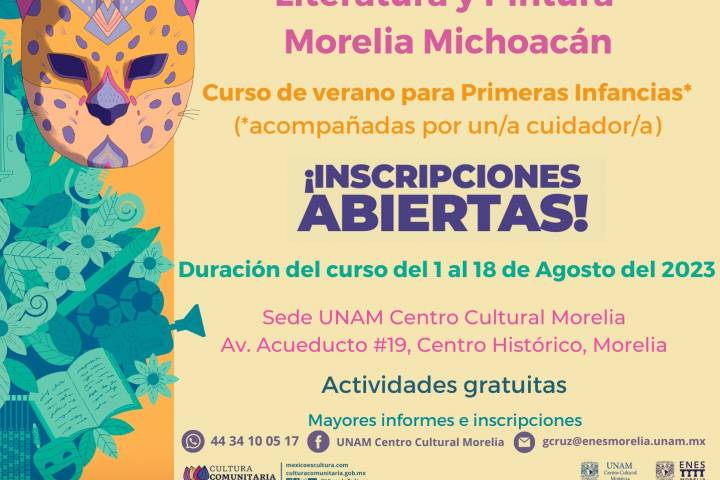 NOTICIAS 26/07/2023Realizan curso de verano para primeras infancias en la UNAM Centro Cultural Morelia Por primera vez, la UNAM Centro Cultural Morelia de la Escuela Nacional de Estudios Superiores (ENES Morelia), en conjunto con Semilleros Creativos del Programa de Cultura Comunitaria adscrito a la Dirección General de Vinculación Cultural de la Secretaría de Cultura del Gobierno de México, realizan el curso de verano para primeras infancias con talleres artísticos y culturales de literatura, artes plásticas y teatro del 01 al 18 de agosto ... Ver más...
