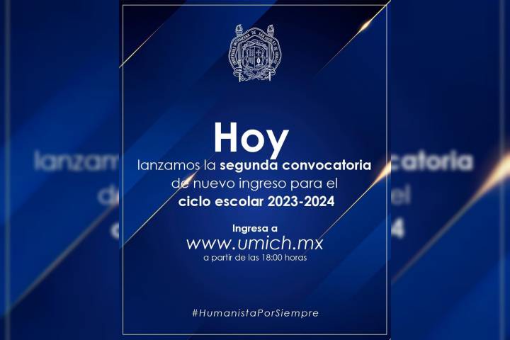 NOTICIAS 05/07/2023A las 6 de la tarde se publica segunda convocatoria de ingreso a la UMSNHEste miércoles 5 de julio a partir de las 18:00 horas se publicará en el portal de internet de la Universidad Michoacana de San Nicolás de Hidalgo (UMSNH), la segunda convocatoria de ingreso al ciclo escolar 2023-2024. El secretario Académico, Jorge Fonseca Madrigal, exhortó a las personas interesadas a que realicen el trámite de manera personal, pues no se tienen intermediarios.