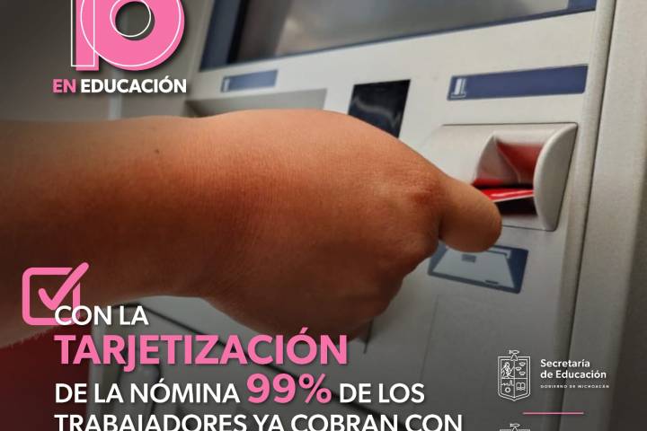 NOTICIAS 17/05/2023Tarjetización de docentes en Michoacán alcanza el 99%: SEEHoy, la tarjetización del magisterio michoacano es una realidad, se ha alcanzado el 99 por ciento de trabajadores que recibe su nómina vía electrónica y ya no con cheque, lo que significa un paso a favor de la transparencia y en beneficio de las y los maestros.