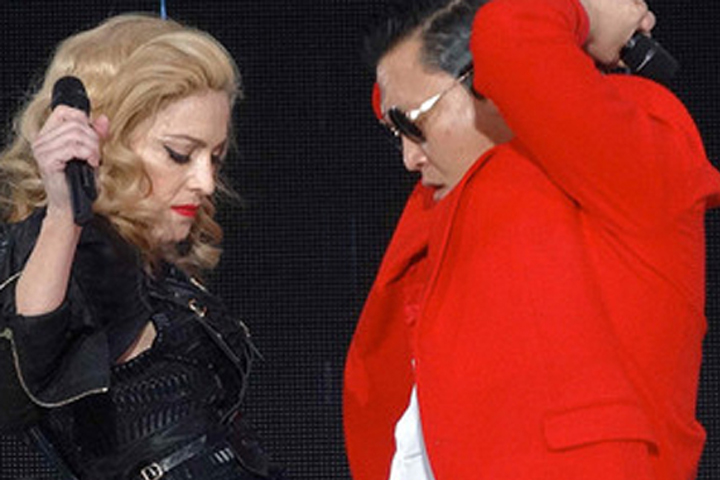 NOTICIAS 14/11/2012Madonna "se rinde" ante el ritmo del Gangam StyleMadonna en su gira "MDNA Tour" sorprendió a sus fanáticos con la presentación de Psy en el escenario, el rapero surcoreano autor del hit "Gangman Style".