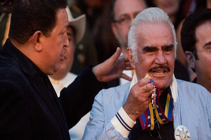 NOTICIAS 12/09/2012Chávez canta al lado de Vicente FernándezEl presidente de Venezuela, Hugo Chávez, recibió este miércoles en el palacio presidencial de Miraflores al cantante mexicano Vicente Fernández, con quien incluso cantó, informó EFE.