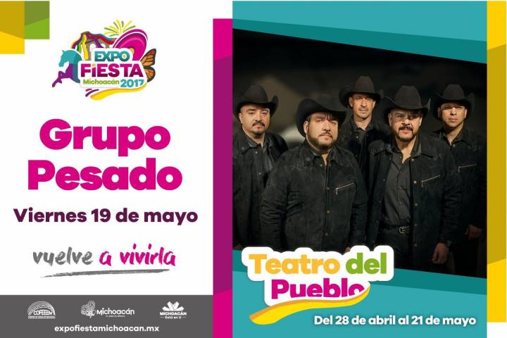 NOTICIAS 19/05/2017Grupo Pesado, esta noche en la Expo Fiesta Michoacán Esta noche Grupo Pesado llega al escenario del Teatro del Pueblo de la Expo Fiesta Michoacán, donde deleitará con sus éxitos a todos sus fans