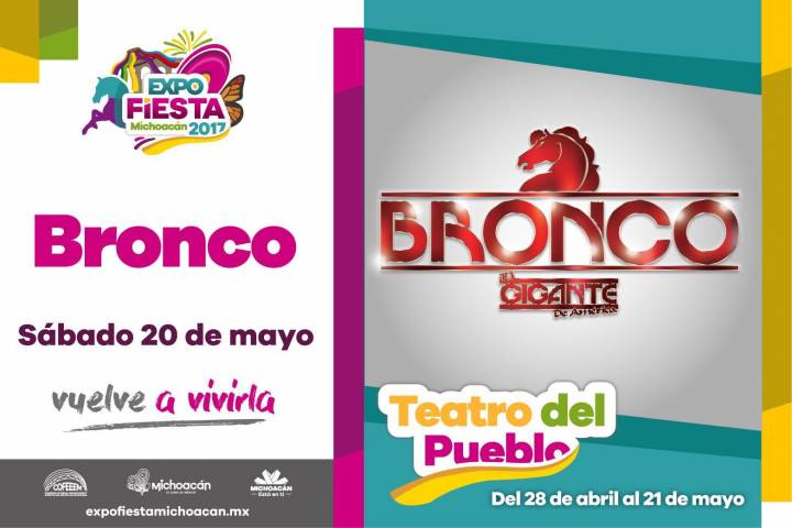 NOTICIAS 20/05/2017Hoy, Bronco y Julión Álvarez en la Expo Fiesta Michoacán Esta noche el Teatro del Pueblo de la Expo Fiesta Michoacán recibe a Bronco, que ofrecerá un concierto totalmente gratis para quienes adquieran su boleto de entrada al Recinto Ferial, el cual tiene un costo de sólo 40 pesos.