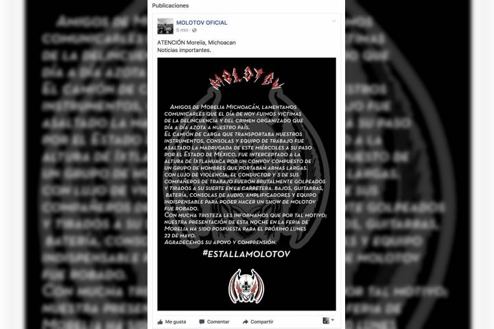 La Comisión de Ferias, Exposiciones y Eventos del Estado de Michoacán (Cofeeem) informa que por causas de fuerza mayor y ajenas a esta dependencia, el concierto que el grupo de rock Molotov ofrecería esta noche en el Teatro del Pueblo de la Expo Fiesta Michoacán se llevará a cabo el próximo lunes. La presentación de la agrupación capitalina tendrá lugar en el mismo escenario, en punto de las 21:00 horas y será totalmente gratuita. ...