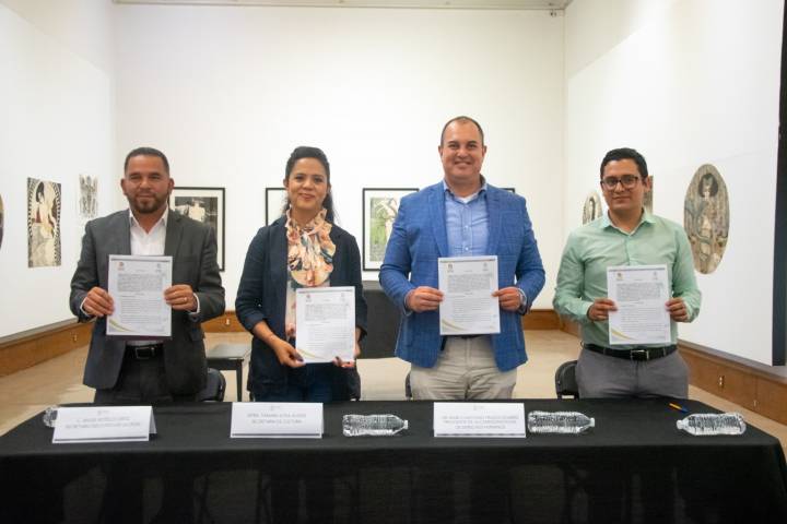 En la Sala 8 del Palacio Clavijero, el Ombudsperson michoacano, Marco Antonio Tinoco Álvarez y la titular de la Secretaría de Cultura en el Estado, Tamara Sosa Alanís, forma... Ver más...