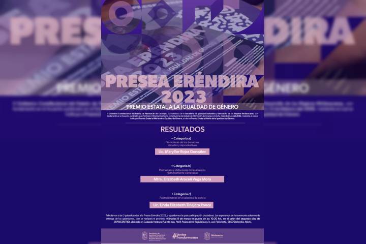 La Secretaría de Igualdad Sustantiva y Desarrollo de las Mujeres Michoacanas (Seimujer), felicitó a las ganadoras de las tres categorías establecidas en la convocatoria de la Presea Eréndira 2023: Maryflor Rojas González, Elizabeth Araceli Vega Mora y Linda Elizabeth Tinajero Ponce.