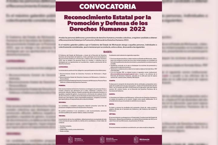 NOTICIAS 02/12/2022Por concluir recepción de propuestas para Reconocimiento Estatal de Derechos HumanosEl Gobierno del Estado de Michoacán, a través de la Secretaría de Gobierno, convoca a todas las personas defensoras y promotoras de derechos humanos y morales colectivas, a registrar candidato a obtener el Reconocimiento Estatal por la Promoción y Defensa de los Derechos Humanos 2022.