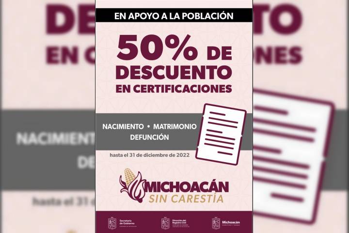 NOTICIAS 02/12/2022Continúan descuentos del 50% en certificaciones de nacimiento, matrimonio y defunciónLa Dirección del Registro Civil recuerda que en apego a las acciones de lucha contra la carestía, continúa con el beneficio del 50 por ciento de descuento en el costo total en certificaciones de nacimiento, matrimonio y defunción.