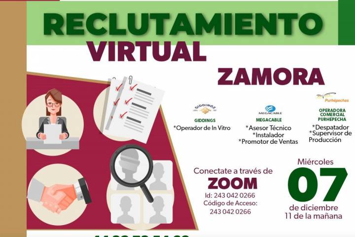 De acuerdo con la agenda de trabajo de la Dirección de Empleo Digno de la Sedeco, el miércoles 7 en Zamora se llevará a cabo el primero de los reclutamientos, en modalidad virtual, e... Ver más...
