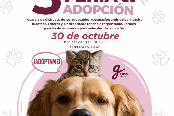 NOTICIAS 27/10/2022Invita DIF a la Tercera Feria de Adopción Canina y FelinaLa presidenta honoraria del Sistema para el Desarrollo Integral de la Familia (DIF), Grisel Tello Pimentel, invitó a la población en general a la Tercera Feria de Adopción Canina y Felina, el próximo domingo 30 de octubre en los Jardines de Centro de Convenciones y Exposiciones de Morelia (Ceconexpo) de 11:00 a 17:00 horas.