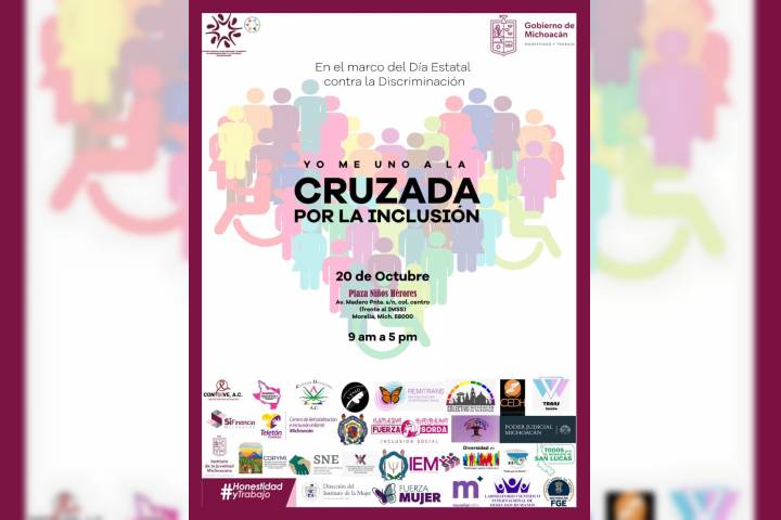 El Consejo Estatal para Prevenir y Eliminar la Discriminación y la Violencia (Coepredv), ha organizado el evento Yo me uno a la cruzada por la inclusión a realizarse el próximo jueves 20 de octubre a partir de las nueve de la mañana y hasta las cinco dela tarde en la Plaza Jardín de los Niños Héroes.