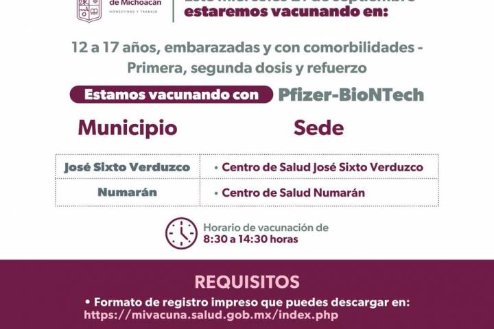 NOTICIAS 21/09/2022Adolescentes de 12 a 17 años serán inmunizados en 33 municipios de MichoacánEl Gobierno de Michoacán da continuidad al Plan Nacional de Vacunación, es así que del 21 al 23 de septiembre se aplicarán primeras y segundas dosis a los adolescentes de 12 a 17 años de edad de 33 municipios de la entidad, así como refuerzos a los jovencitos de este grupo etario con alguna comorbilidad.