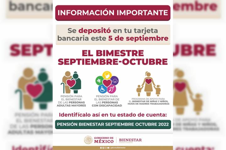 NOTICIAS 05/09/2022SecretarÃa de Bienestar dispersa 46.7 mil mdp a 12.1 millones de derechohabientes de pensiones y programas: Ariadna Montiel Este lunes 5 de septiembre, la SecretarÃa de Bienestar inició la dispersión a 12.1 millones de derechohabientes que cobran a través de tarjetas bancarias y en operativos de pago en las comunidades. La inversión social es mayor a 46 mil 700 millones de pesos de las Pensiones y Programas de Bienestar correspondientes al bimestre septiembre-octubre de 2022.