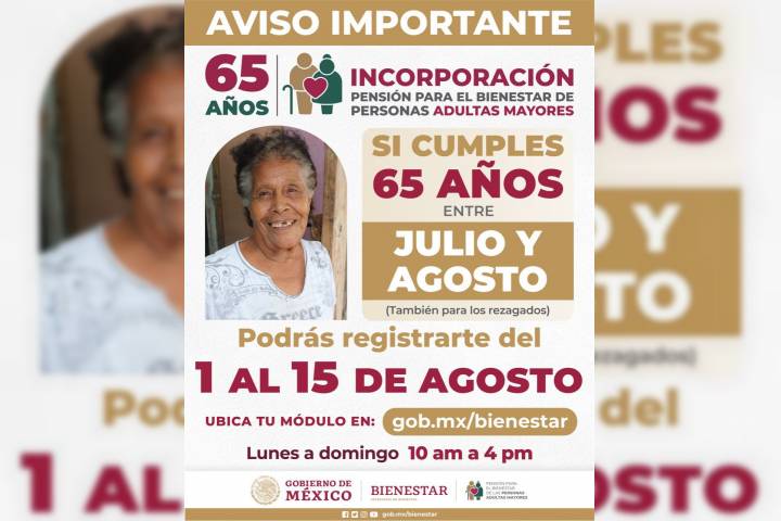 NOTICIAS 01/08/2022Del 1º al 15 de agosto, registro a la Pensión para el Bienestar de las Personas Adultas MayoresEl Gobierno de México, a través de la SecretarÃa de Bienestar, informa que del 1° al 15 de agosto está en curso la nueva etapa de registro para solicitar la incorporación a la Pensión para el Bienestar de las Personas Adultas Mayores, para quienes cumplen 65 años entre los meses de julio y agosto.