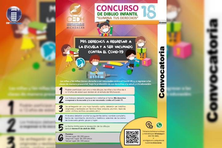 NOTICIAS 08/04/2022Amplia Consejo de la CEDH plazo para participar en Concurso de DibujoEl Consejo de la Comisión Estatal de los Derechos Humanos (CEDH) en Michoacán, aprobó una ampliación a la fecha lÃmite de recepción de dibujos del 18°Concurso de Dibujo "Ilumina tus Derechos", que este año tiene como tema: Mis derechos a regresar a la escuela y a ser vacunado contra el Covid-19.