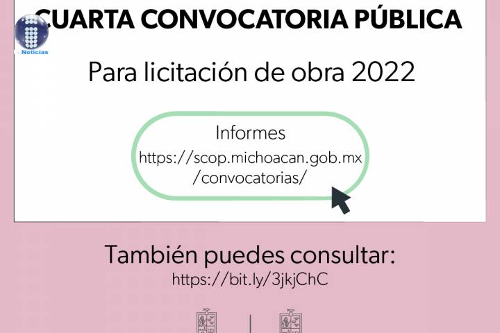 NOTICIAS 11/04/2022Emite SCOP, cuarta convocatoria para licitación de obras públicas 2022 El Gobierno de Michoacán, a través de la SecretarÃa de Comunicaciones y Obras Públicas (SCOP) convoca a las personas fÃsicas o morales interesadas en participar en la cuarta licitación del 2022, para la contratación de cinco obras públicas de rehabilitación y mantenimiento de caminos en los municipios de Charapan, Coeneo y Angamacutiro, asà como de conservación y mantenimiento rutinario en Huetamo.