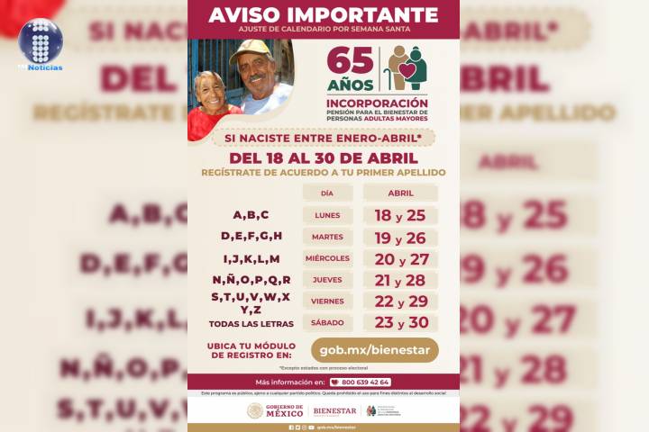 NOTICIAS 12/04/2022El 18 de abril inicia incorporación a Pensión para el Bienestar de las personas Adultas MayoresDel lunes 18 de abril y hasta el sábado 30 se realizará el registro a la Pensión para el Bienestar de las Personas Adultas Mayores en todo el paÃs; podrán llevar a cabo el proceso quienes hayan cumplido 65 años entre los meses de enero y abril del presente año.