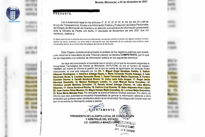 NOTICIAS 31/01/2022Sindicato de la UTOM creado por exrectora con directivos y personal fantasmaEl Sindicato Único de Trabajadores de la Universidad Tecnológica del Oriente de Michoacán (SUTUTOM) con número de registro 12/2021, no tiene legitimidad de origen, según registros que resguarda la junta local de conciliación y arbitraje del estado de Michoacán, el padrón de socios inicial está conformado por la exrectora Mayra Vanesa Mejía Granados, 6 directores de área que en ese momento ocupaban un cargo de confianza, 7 personas que ... Ver más...