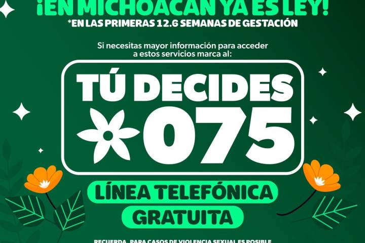 NOTICIAS 20/05/2025El derecho a decidir informada: Seimujer lanza línea telefónica sobre el aborto voluntario y seguro Con el compromiso de garantizar los derechos sexuales y reproductivos de las mujeres, adolescentes y personas con capacidad de gestar, la Secretaría de Igualdad Sustantiva y Desarrollo de las Mujeres Michoacanas (Seimujer), encabezada por Alejandra Anguiano González, puso en funcionamiento la línea gratuita "Tú decides" con marcación 075.