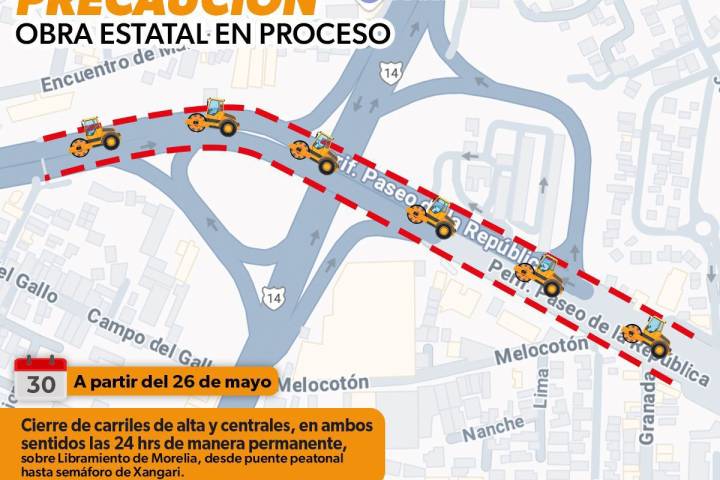 NOTICIAS 25/05/2025A partir de mañana cierre temporal de carriles sobre libramiento de MoreliaLa Secretaría de Comunicaciones y Obras Publicas (SCOP) informa que, derivado de la construcción del distribuidor vial de salida Pátzcuaro, se cerrarán de manera temporal los carriles de alta y media velocidad sobre el libramiento de Morelia en dicho polígono, a partir del lunes 26 de mayo del presente año.