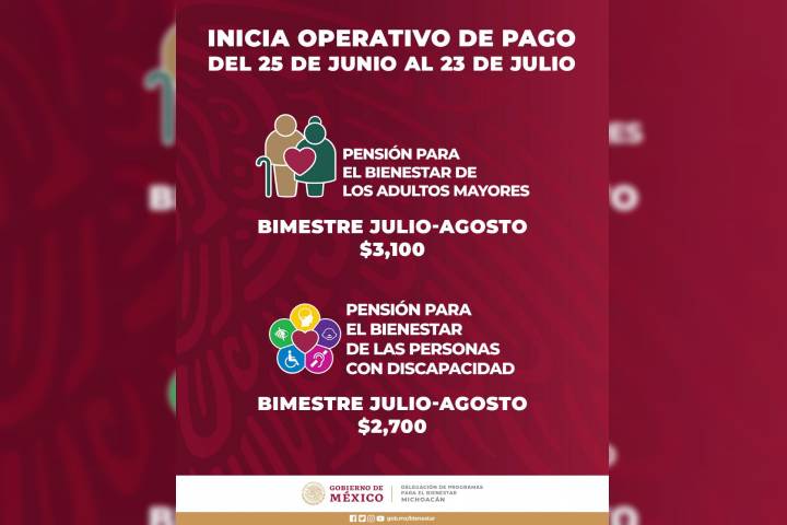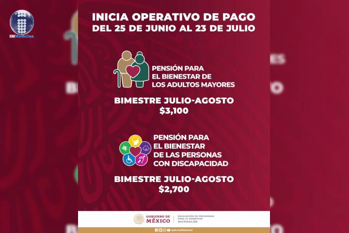 NOTICIAS 24/06/2021Iniciará Bienestar Michoacán operativo de pago a Adultos Mayores y Personas con DiscapacidadDel 25 de junio al 23 de julio la Secretaría de Bienestar delegación Michoacán llevará a cabo el operativo de pago de las pensiones para Personas Adultas Mayores y Personas con Discapacidad, correspondiente al bimestre julio-agosto del año en curso; quienes cobran vía tarjeta bancaria ya cuentan con este depósito.
