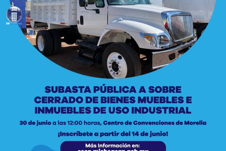 NOTICIAS 18/06/2021Convocan a tercera subasta de bienes de la Junta de Caminos en liquidación El Gobierno de Michoacán, a través de la SecretarÃa de Comunicaciones y Obras Públicas (SCOP), convoca a la subasta número SCOP/003/2021 para la enajenación de bienes muebles e inmuebles propiedad de la Junta de Caminos, en liquidación, que se desarrollará el miércoles 30 de junio de 2021, a las 12:00 horas, en el Centro de Convenciones y Exposiciones (Ceconexpo) de Morelia.