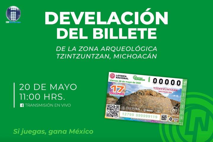 NOTICIAS 19/05/2021Develarán billete de la Lotería Nacional alusivo a Tzintzuntzan La grandeza de Michoacán se conoce a través de sus zonas arqueológicas y ciudades prehispánicas, entre las que destaca Tzintzuntzan, capital del Imperio Purépecha.
