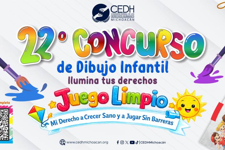 Con el objetivo de que las infancias hagan valer su derecho a una convivencia sana, la Comisión Estatal de los Derechos Humanos de Michoacán, a través de la Unidad de Comunicación Social, da a conocer la edición 22° del Concurso de Dibujo Infantil "Ilumina tus derechos", que en esta ocasión tiene como tema "Juego limpio. Mi derecho a crecer sano y jugar sin barreras".