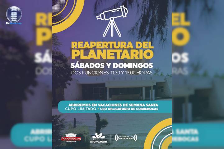 NOTICIAS 26/03/2021Planetario de Morelia reabre sus puertas los fines de semana Con todas las medidas sanitarias y con un aforo que respete la sana distancia para evitar la propagación del COVID-19, el Planetario de Morelia reabre sus puertas al público en general, con funciones sólo los fines de semana.