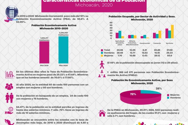 NOTICIAS 23/03/2021En diez años Michoacán aumentó de 51 a 62 por ciento su Población Económicamente Activa: CoespoEn la segunda entrega del Consejo Estatal de Población (Coespo), sobre los datos más significativos para la población en la entidad, con base en los resultados del Censo de Población y Vivienda, 2020 presenta las CaracterÃsticas Económicas de la Población.
