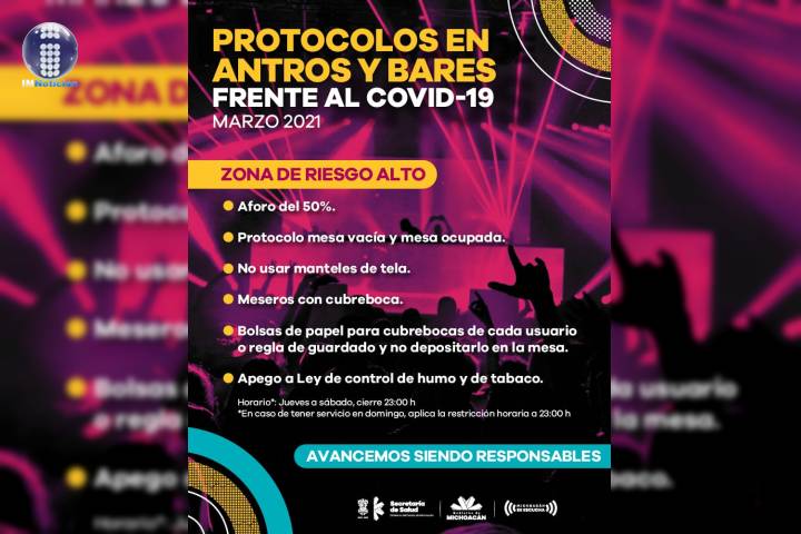 NOTICIAS 04/03/2021Antros y bares deben funcionar con 50% de aforo Para lograr la reactivación gradual del sector económico sin desatender las medidas de prevención para evitar el COVID-19, en este mes, los antros y bares deberán cumplir de manera estricta con las medidas emitidas por la Secretaría de Salud.