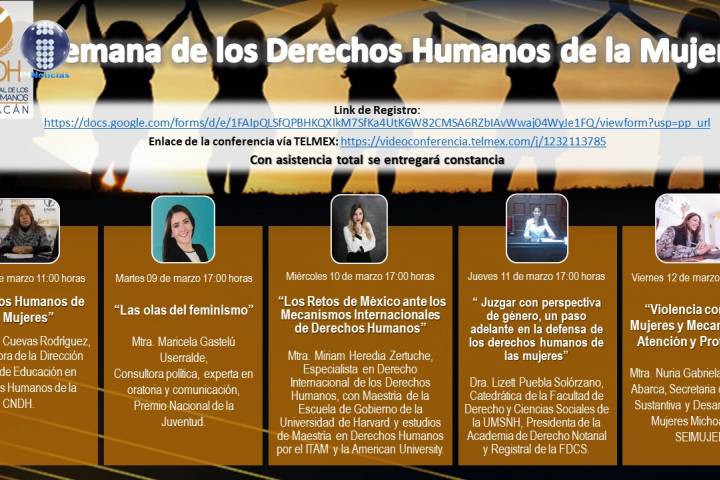 NOTICIAS 01/03/2021Realizará CEDH semana de los derechos humanos de la mujerComo parte de las actividades en el marco del Día Internacional de la Mujer, la Comisión Estatal de los Derechos Humanos (CEDH) en Michoacán, realizará la Semana de los Derechos Humanos de la Mujer del lunes 08 al viernes 12 de marzo.