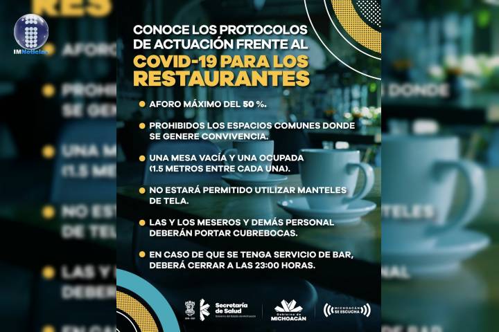 NOTICIAS 02/03/2021En Michoacán, restaurantes deberán operar con estrictas medidas de higiene Con el objetivo de lograr una apertura gradual del sector económico en Michoacán, los restaurantes podrán abrir sus puertas de manera normal, pero atendiendo estrictas medidas de prevención e higiene ante el COVID-19.