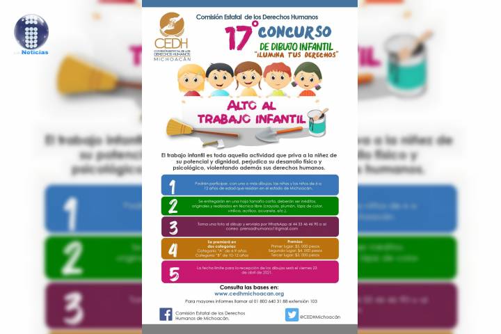 Con el tema Alto al trabajo infantil, la Comisión Estatal de los Derechos Humanos (CEDH) en Michoacán, abrió la convocatoria de su tradicional Concurso de Dibujo "Ilumina tus derechos" en su edición número 17.