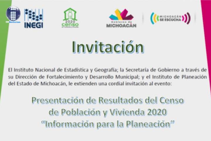 NOTICIAS 16/02/2021Inicia difusión de información del Censo 2020 a nivel municipalComo parte de las acciones de colaboración entre el Instituto Nacional de Estadística y Geografía (INEGI); la Secretaría de Gobierno (SG), a través de su Dirección de Fortalecimiento y Desarrollo Municipal; y el Instituto de Planeación del Estado de Michoacán (IPLAEM), entre este lunes 15 y el viernes 19 de febrero se llevan a cabo sesiones virtuales de "Presentación de los Resultados del Censo de Población y Vivienda 2020. Información... Ver más...