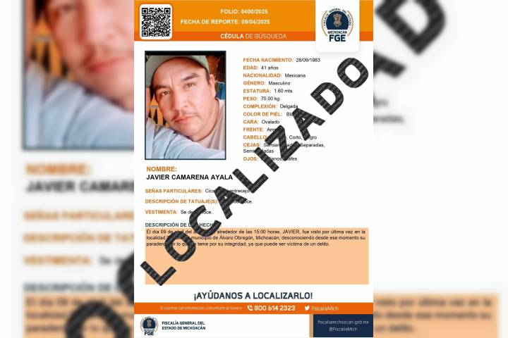 Ya fue encontrado con vida Javier Camarena Ayala, de 41 años de edad, chofer de la combi 23 de la Ruta Gris Negra de Tarímbaro, persona que había sido reportada como desaparecida el día de ayer miércoles tras el presunto robo de su vehículo de trabajo, indicaron fuentes allegadas al tema.