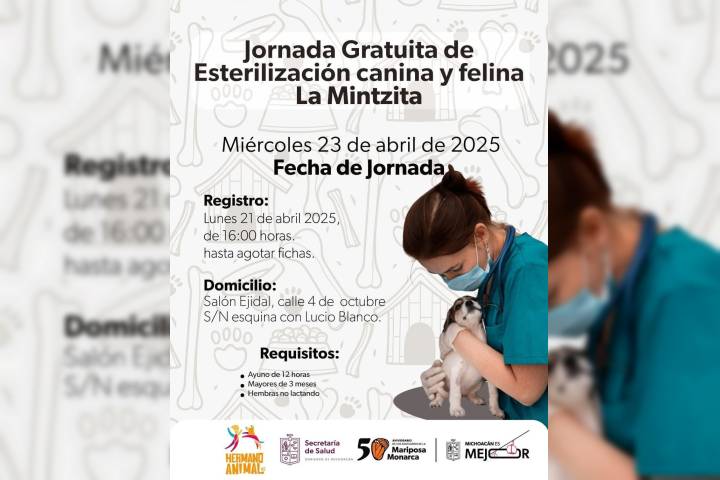 NOTICIAS 21/04/2025Esterilizar para no abandonar: Hermano Animal lanza jornada gratuita en La MintzitaLa organización "Hermano Animal", en conjunto con el Colectivo Rescatistas Independientes de Michoacán y autoridades estatales, ha convocado a la ciudadanía a participar en su jornada gratuita de esterilización canina y felina, la cual se llevará a cabo en la comunidad de La Mintzita.