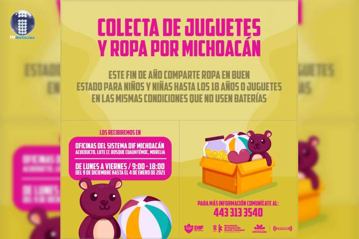 NOTICIAS 12/12/2020Invita Gobierno del Estado a colecta de juguetes y ropaEl Gobierno de Michoacán, a través del Sistema para el Desarrollo Integral de la Familia, DIF Michoacán, en coordinación con la Secretaría de Desarrollo Social y Humano (Sedesoh), invita a las y los michoacanos a participar en la "Colecta de Juguetes y Ropa por Michoacán".
