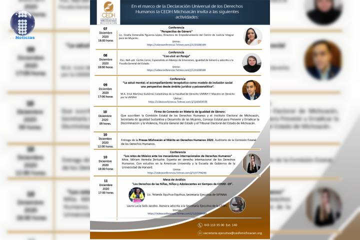 NOTICIAS 07/12/2020Presenta CEDH programa de la semana por los derechos humanosLa CEDH Michoacán realizará la Semana por los Derechos Humanos, en el marco de la Declaración Universal de los Derechos Humanos, que se conmemora este 10 de diciembre, con el propósito de fomentar el respeto de los derechos y libertades de los michoacanos y contribuir a construir una sociedad incluyente.