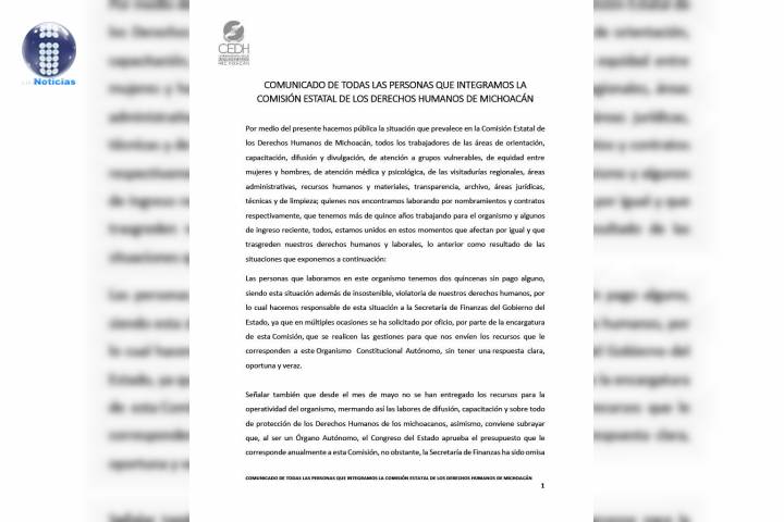 NOTICIAS 18/11/2020Exige CEDH asignación de recursos para operar El personal de base y de confianza de la Comisión Estatal de los Derechos Humanos (CEDH) emite un pronunciamiento a la opinión pública ante la omisión, desde el mes de mayo, de la Secretaría de Finanzas y Administración en la entrega de los recursos que fueron autorizados para este año por el Congreso de Michoacán para la operatividad del organismo; situación que además deriva en el adeudo de dos quincenas a los trabajadores de la insti... Ver más...