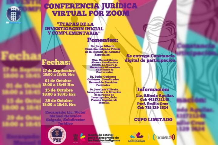 NOTICIAS 15/10/2020Capacitan a abogados indÃgenas en materia de investigación inicial y complementaria La Comisión Estatal para el Desarrollo de los Pueblos IndÃgenas mantiene las capacitaciones a los abogados indÃgenas de Michoacán.